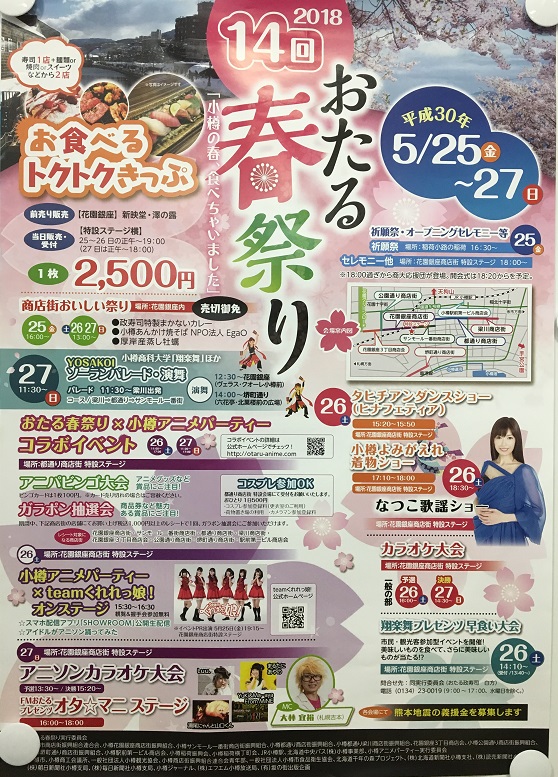 小樽市の春の恒例イベント、「第14回おたる春祭り」が開催されます。 毎年恒例の指定された飲食店をはしごする「喰いだおれ大会」や、小樽商科大学「翔楽舞」の演舞、 小樽アニメパーティーとのコラボ企画、大抽選会など様々なイベン […]
