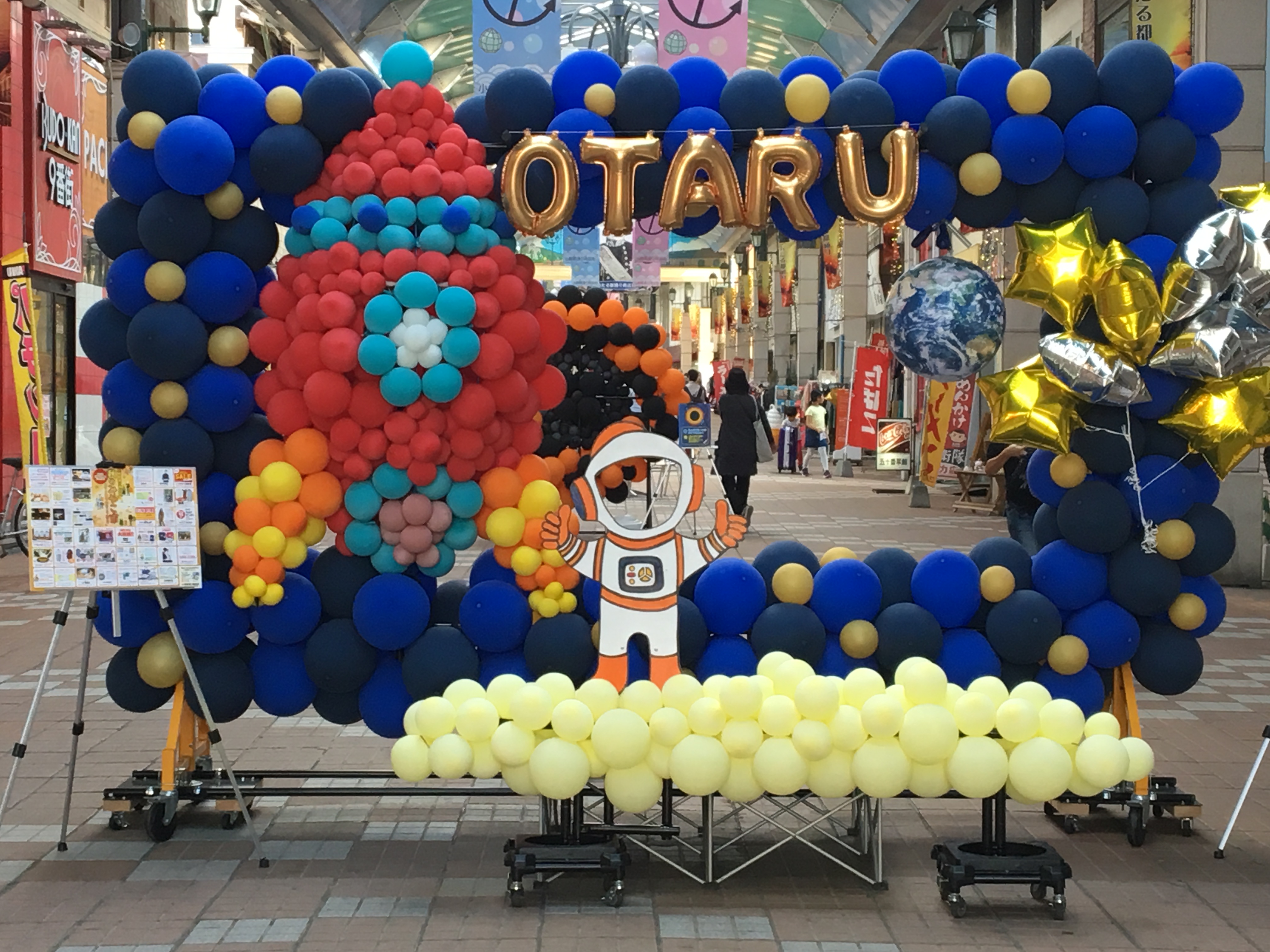 アートストリートでは、宇宙をテーマにクロさん.カームさん兄弟、小樽商科大学笑店メンバーの方々とで、2,000~3,000の風船を使って二日がかりで制作されました。素晴らしい銀河系が出来上がっていました。