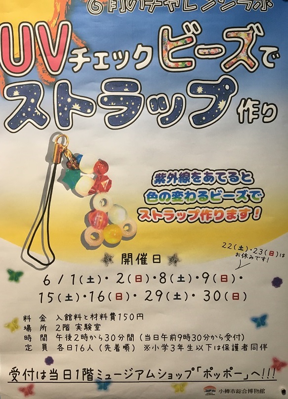 6月のチャレンジラボは大人気の「UVチェックビーズでストラップ作り」です! 紫外線(UV)量の多くなるこの季節。紫外線をあてると色の変わるビーズのついたストラップを作って、人間の目ではみることのできない紫外線をぜひ確認し […]