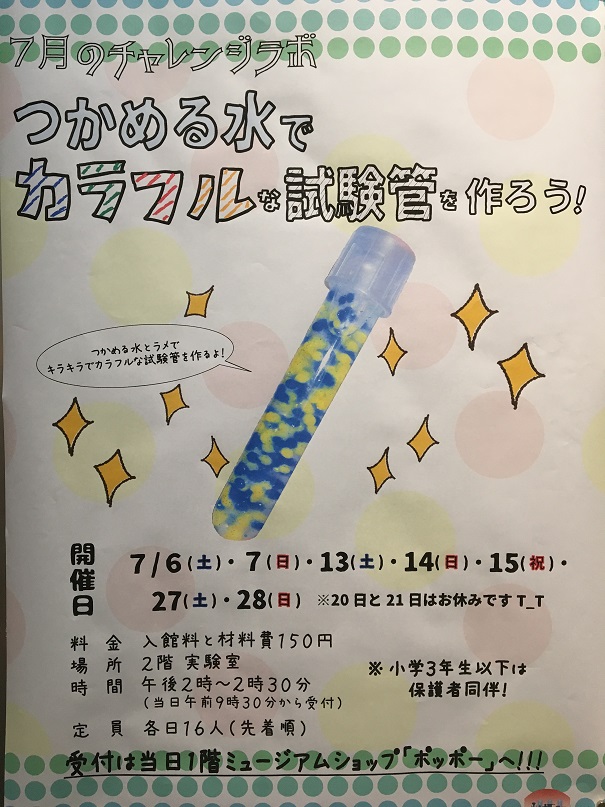 色つきのつかめる水などを使ってカラフルな試験管を作ります。 どんなふうに作るのか、体験してみませんか?! ・ ・ ● ● ● 7月のチャレンジラボ「つかめる水でカラフルな試験管を作ろう!」● ● ● ・ ■日時:6(土) […]