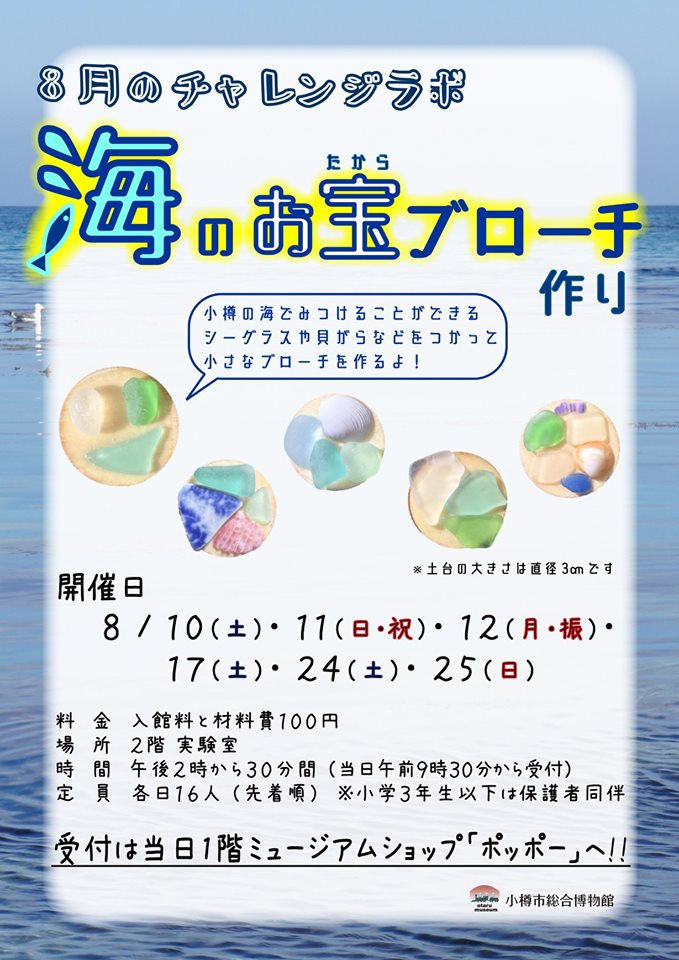 8月は「海のお宝ブローチ作り」を行っています。 小樽の海岸でひろえるシーグラスや貝がらをつかって オリジナルのブローチを作製します。 小樽の海岸や海岸でひろうことができるものたちの紹介も行いますよ! 今月は、残り3回です […]