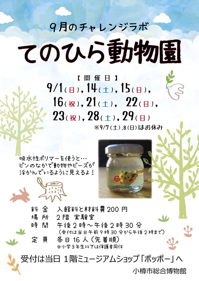 吸水性ポリマーを使って、瓶を横にしても中に入っているマスコットやビーズが動かない不思議な置物を作ります。手のひらに乗るサイズなので、お部屋のちょっとしたインテリアにもおすすめです。マスコットはウサギ、クマ、リスの中から一 […]