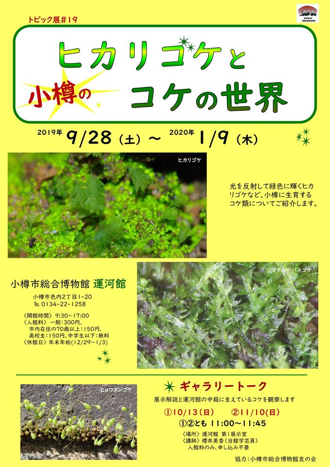 現在総合博物館運河館では、「小樽のヒカリゴケとコケの世界」が 9月28日(土)~2020年1月9日(木)まで開催中です。 本日は、学芸員の櫻井美香氏のギャラリートークのが開催されます。 「小樽のヒカリゴケとコケの世界」の […]
