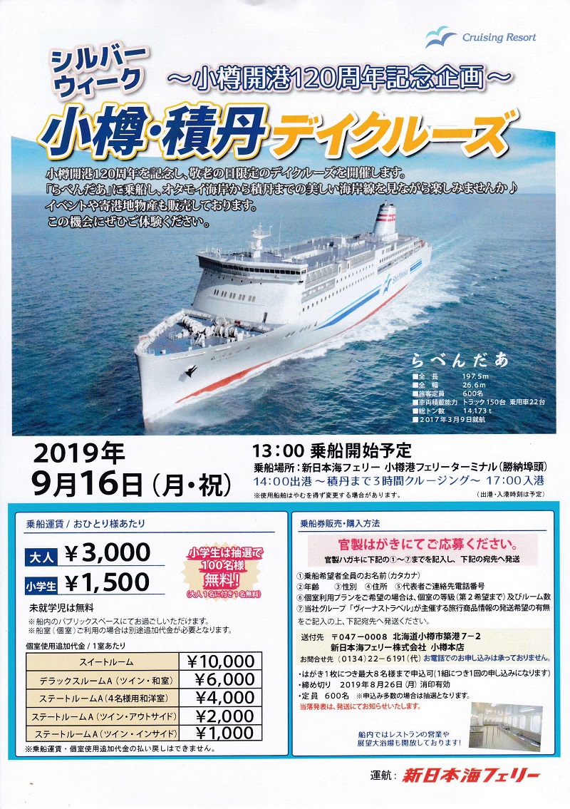 新日本海フェリーでは小樽開港120周年記念企画 として 2019年9月16日(月・祝日)に 「小樽開港120周年記念企画 ~シルバーウィーク小樽・積丹デイクルーズ」 を開催します。 新日本海フェリー「らべんたあ」に乗船し […]