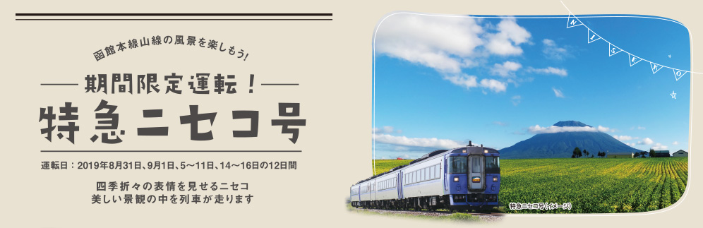今年も期間限定で函館本線山線(札幌~倶知安~ニセコ~函館) を走る特急ニセコ号を運行します。 四季折々の表情を見せるニセコ、美しい景色の中を列車が走ります。 詳しい内容はニセコ鉄道紀行/JR北海道のHPでご確認ください。 […]