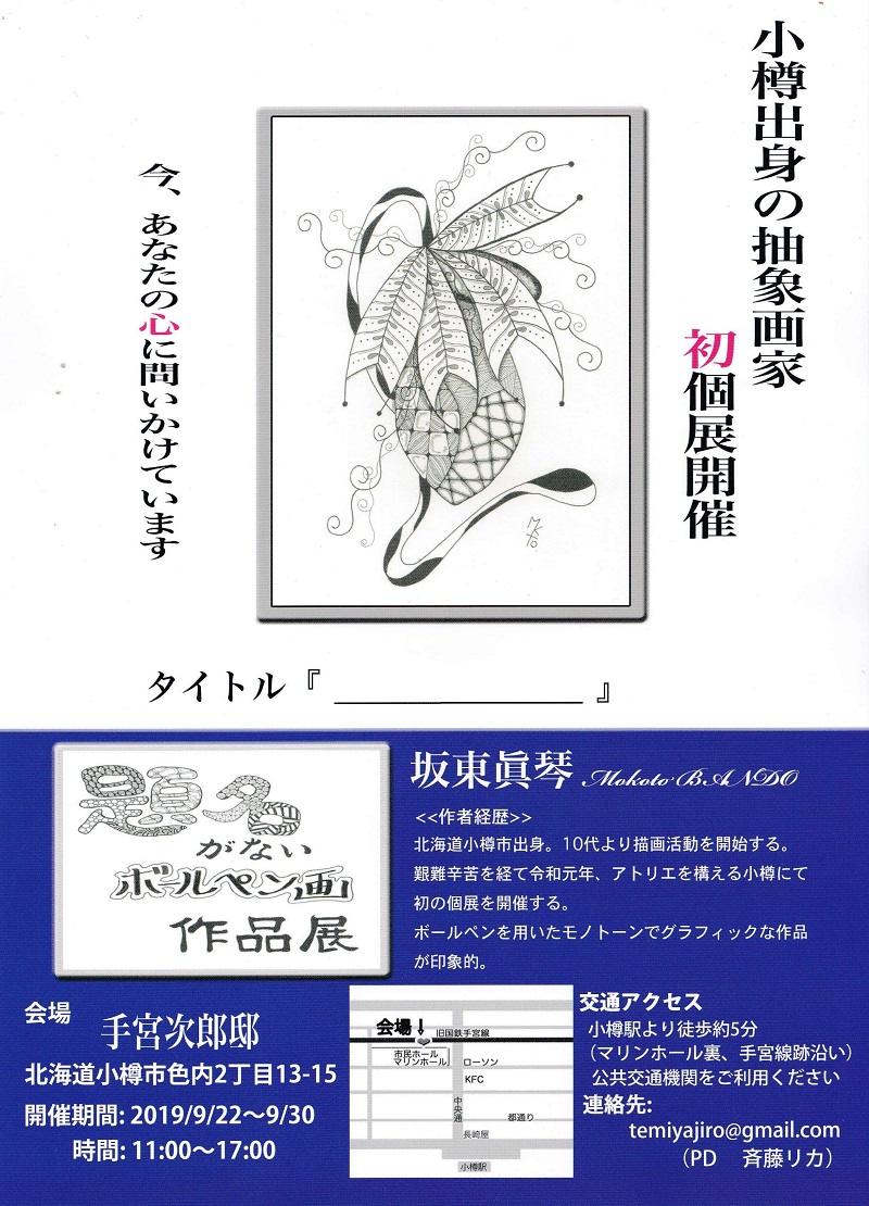 小樽出身の抽象画家坂東眞琴さんの初個展を 「手宮次郎」で開催します。 喫茶店なので、飲み物を飲みながらゆっくり鑑賞、 作品のみの見学もOKです。入場無料です。 ・ ・ ● ● ● 題名がないボールペン画作品展 ● ● ● […]