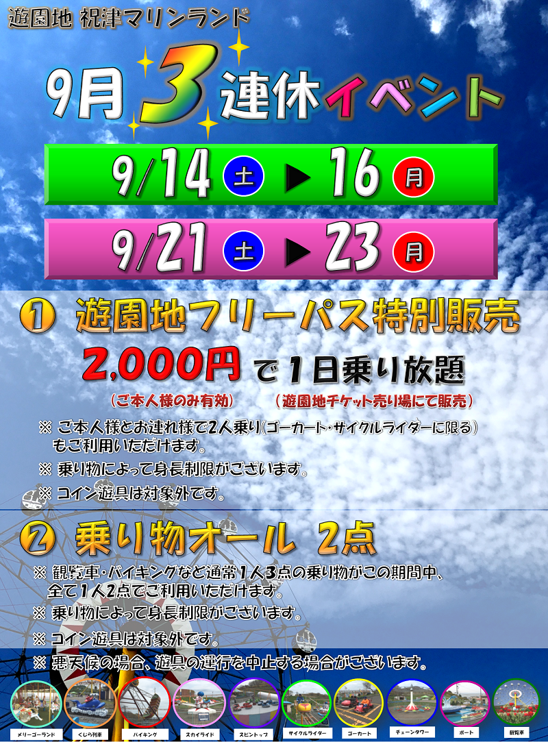 おたる水族館本館の隣にある遊園地「祝津マリンランド」では 9月の3連休(9月14日~16日、21日~23日) に 遊園地フリーパスの特別販売と乗り物オール2点を実施します。 遊園地「祝津マリンランド」の入園料は無料です。 […]
