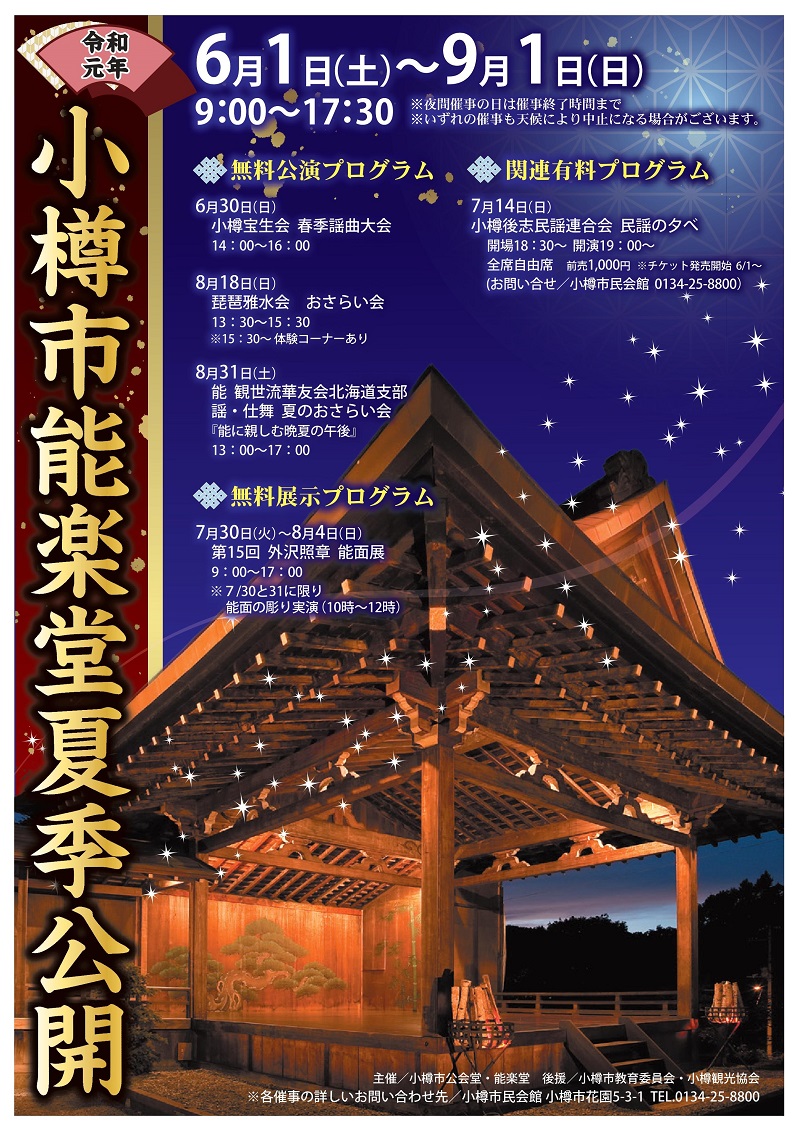小樽市の歴史的建造物【小樽市能楽堂】の夏季公開を 今年も6月1日より開催致します。 会期中は多彩なプログラムを予定しておりますので、 どうぞお楽しみ下さい。 【開催日時】 令和元年6月1日 (土) ~ 9月1日 (日) […]