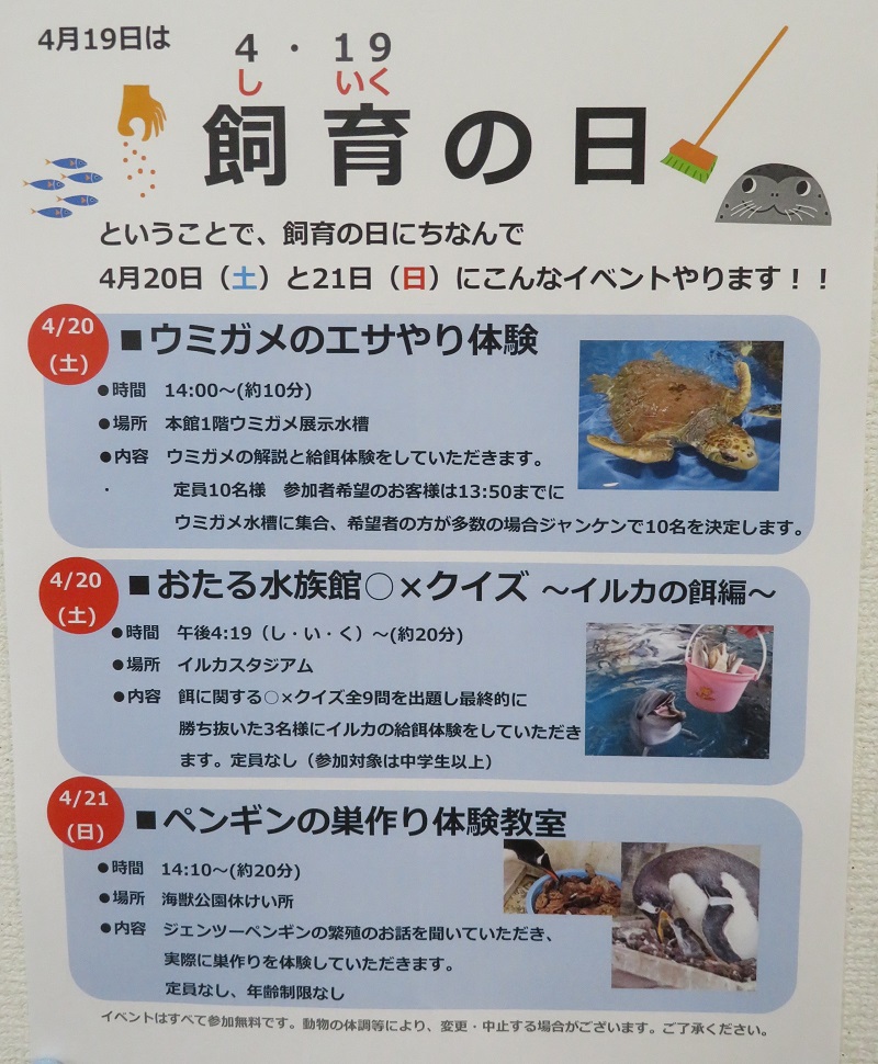 公益社団法人日本動物園水族館協会では、4月19日を「飼育の日」としています。 おたる水族館では「飼育の日」にちなみ、以下の内容でイベントを開催いたします。 / ●2019年4月20日(土)「飼育の日」イベント / ?ウミ […]