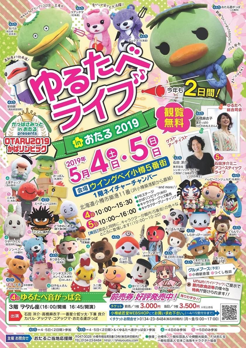 ゆるたべライブ in おたる2019 (5/4・5 ウイングベイ小樽)開催されます。 ゆるキャラが集結する「ゆるたべライブ」、二日間のイベントです。。 高知県安田町から初来道の「安田朗」など、多くのゆるキャラが集結します […]