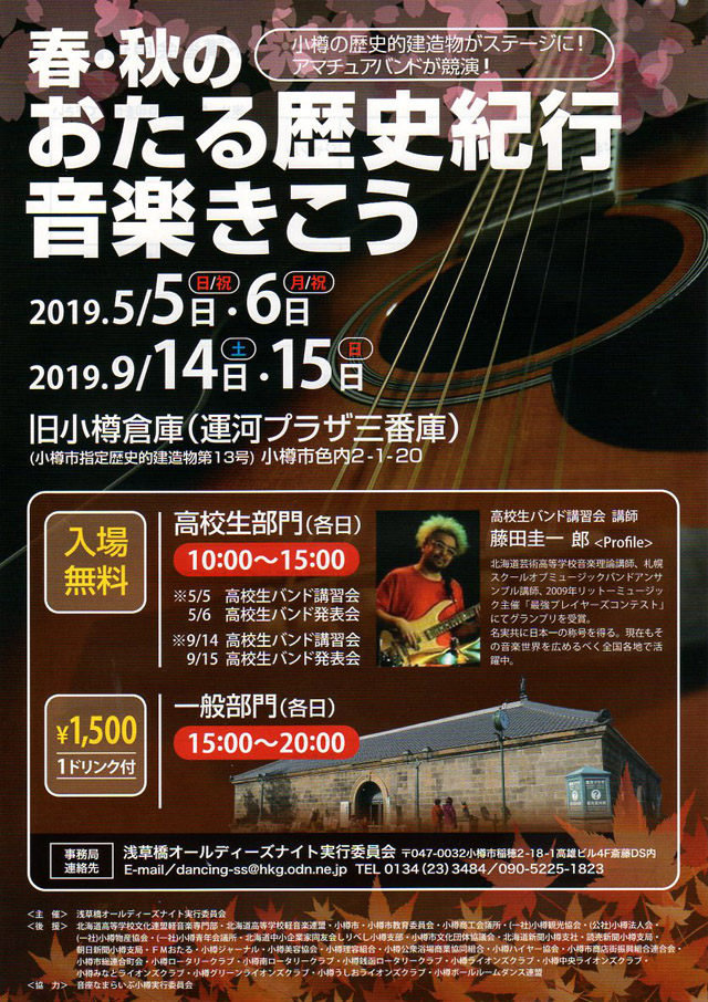 今回で9回目を迎えます「秋のおたる歴史紀行音楽きこう」が、 歴史的建造物である旧小樽倉(運河プラザ3番庫)で 9月14日(土)・15日(日)に開催されます。 高校生バンドの講習会と発表会を無料公開し、 一般バンドは両日と […]