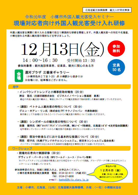 外国人観光客の受け入れ体制の整備や人材育成を、 目的にセミナーを開催します。 現場対応者向け外国人観光客受け入れ研修 日本、北海道のインバウンドの現状と、災害時の外国人観光客に対する 具体的な対応について学びましょう。 […]