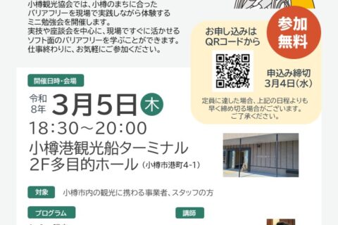 「小樽観光 バリアフリーミニ勉強会」を開催します。 小樽観光協会では、小樽のまちに合ったバリアフリーを現場で実践しながら体験するミニ勉強会を開催します。実技や座…2026年02月03日 -