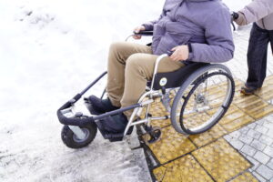 右の車椅子は「快適AQRO」を装着しています。雪道や砂利道など悪路でも快適に移動できます。