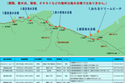 小樽市内で今年度開設された海水浴場は5か所です。北海道の夏も、年々夏日、真夏日が多くなってきていますので、海水浴場に行く機会も多いかと思います。くれぐれも、マ…2025年07月14日 -