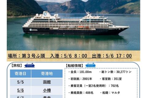 クルーズ船「飛鳥Ⅱ」…9/7小樽第3号ふ頭寄港予定