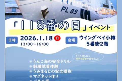 小樽海上保安部では、2026年1月18日の「118番の日」に ウイングベイ小樽にてイベントを実施いたします。 制服試着やうみまるとの記念撮影、 マグネット作り、…2026年01月03日 -
