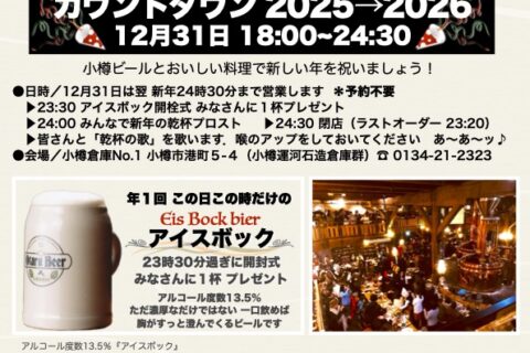 小樽ビールとおいしい料理で新しい年を祝いましょう!年に1回のアイスボック開栓式。アルコール度数13.5%、ただ濃厚なだけではない、一口飲めば胸がすっと澄んでくる…2025年12月26日 -