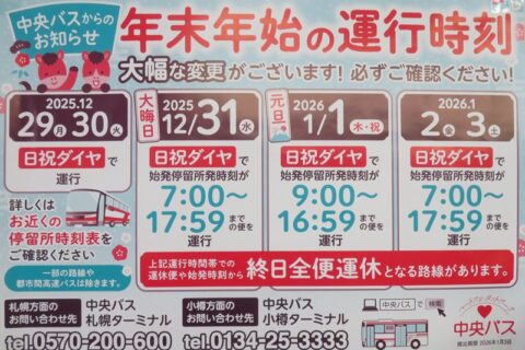 中央バスから2025年~2026年 年末年始ダイヤのお知らせです。 中央バス小樽市内線・高速おたる号は 2025年12月29日(月)30日(火)は日祝ダイヤ 2…2025年12月26日 -