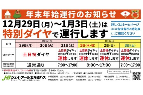 ジェイ・アール北海道バスから2025年~2026年 年末年始ダイヤのお知らせです。 / 🎍年末年始運行のお知らせ🚌 2025年12月29日(月)~2026年1月…2025年12月26日 -