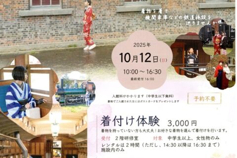 着物を着て、機関倉庫などの鉄道施設を巡りませんか。 着付け体験やプロのカメラマンによる写真撮影も行います。 明治のたてものを背景に、着物姿で思い出の1枚を撮りま…2025年10月04日 -