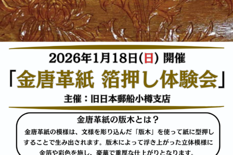 旧日本郵船株式会社 小樽支店 金唐革紙・箔押し 体験を開催します。 ●金唐革紙の版木とは? 金唐革紙の模様は、文様を彫り込んだ「版木」を使って紙に型押しすること…2025年12月15日 -