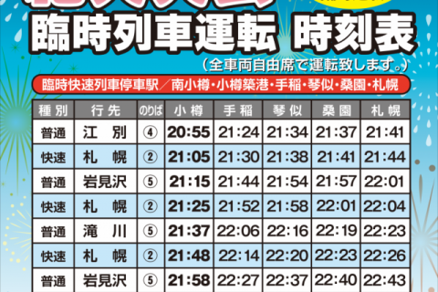 ・・ JR 北海道では、 7月29日(日)潮まつり最終日の花火大会終了後、 小樽駅より臨時列車を運行いたしますのでご利用ください。 詳しくはこちら…2018年07月26日 -