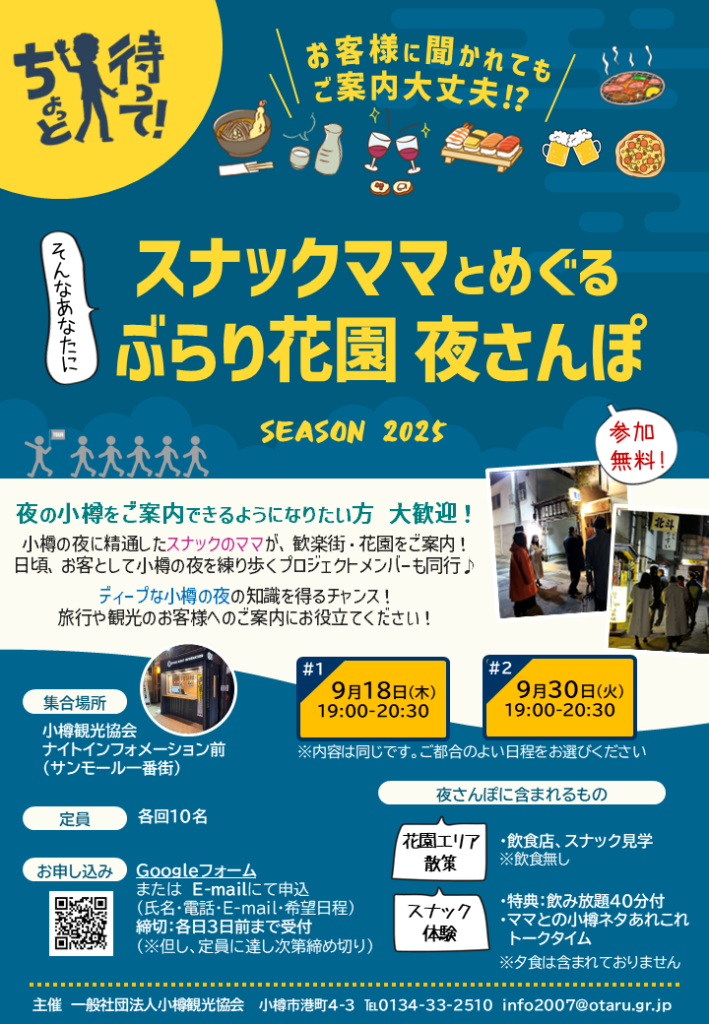 小樽の夜に精通したスナックのママが、歓楽街・花園をご案内します。日頃、お客として小樽の夜を練り歩くプロジェクトメンバーも同行♪ディープな小樽の夜の知識を得るチャンスです。旅行や観光のお客様へのご案内にお役立てください!