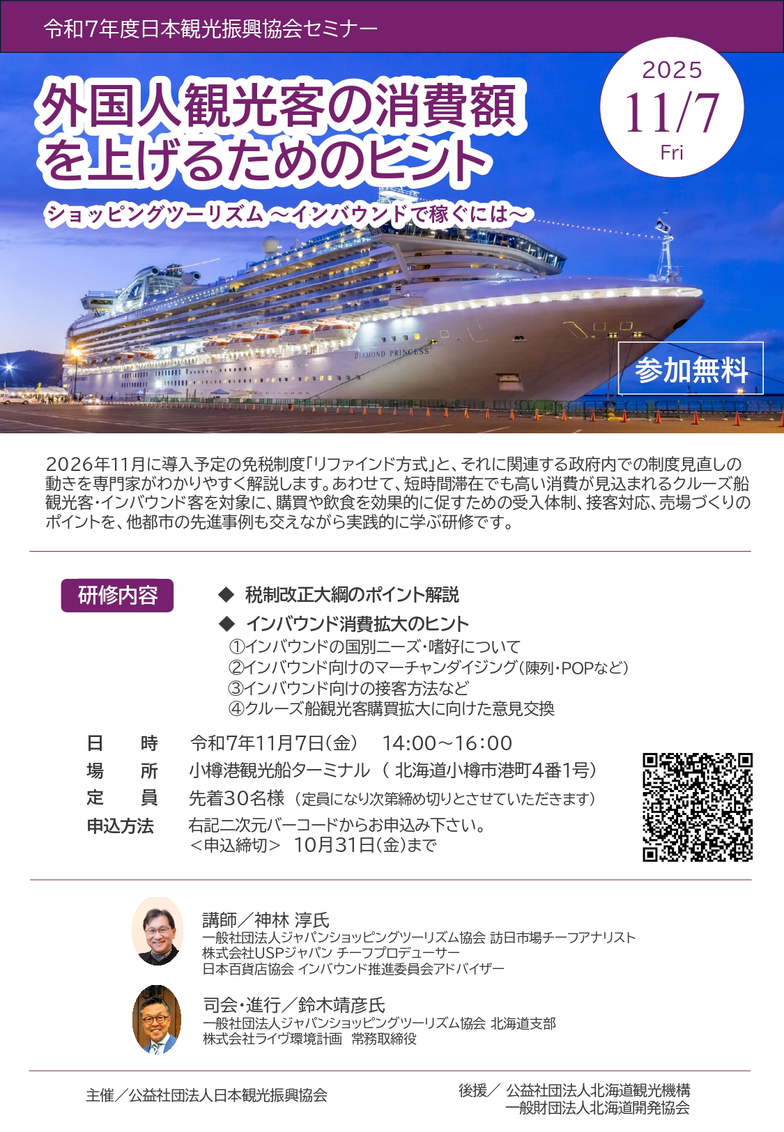 2026年11月に導入予定の免税制度「リファインド方式」と、それに関連する政府内での制度見直しの動きを専門家がわかりやすく解説します。あわせて、短時間滞在でも高い消費が見込まれるクルーズ船観光客・インバウンド客を対象に、購買や飲食を効果的に促すための受入体制、接客対応、売場づくりの ポイントを、他都市の先進事例も交えながら実践的に学ぶ研修です。