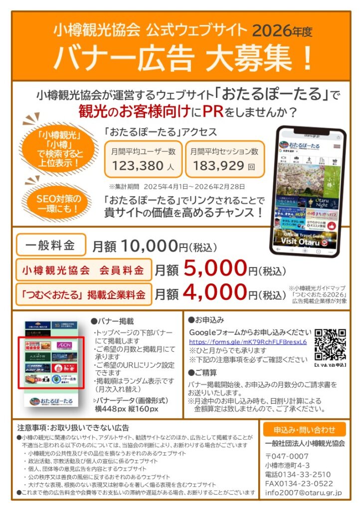 小樽観光協会が運営する公式サイト「おたるぽーたる」の令和8年度 ウェブバナー広告(トップページ掲載)を募集します。