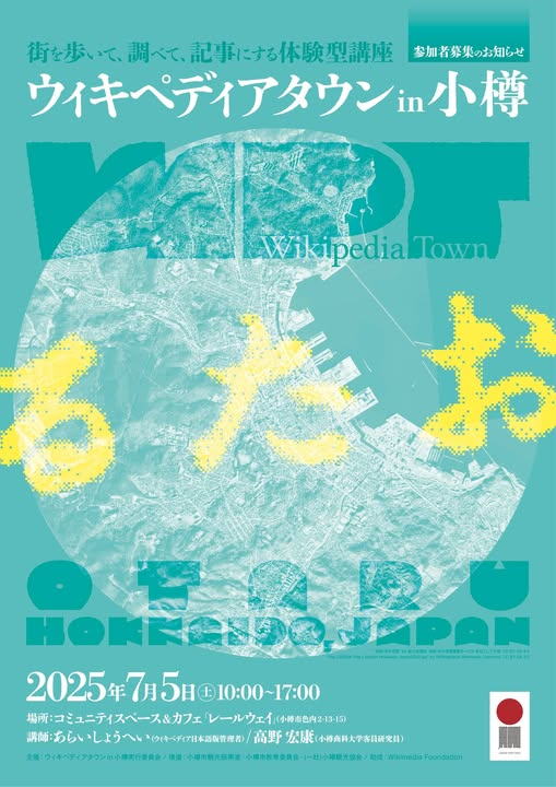 まちを歩いて、調べて、学びながら、ウィキペディアの記事を作成する体験型講座「ウィキペディアタウンin小樽」が、7/5(日)に開催されます。