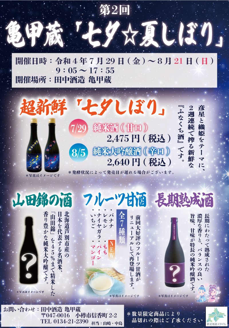四季折々に日本酒を楽しむ風習は、誇れる日本の食文化です。そこで、北海道・小樽の地酒をもっと知っていただきたくイベントである「亀甲蔵 七夕☆夏しぼり」を開催いたします。