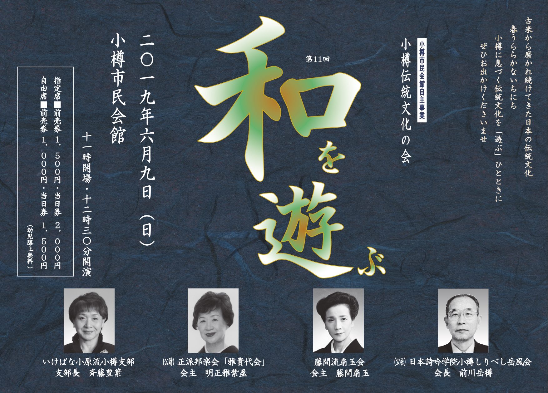 「小樽に今も息づいている伝統文化を楽しむ」をコンセプトに、芸、技、味を堪能できる催しです。詩吟の体験や茶席、花や歌の作品展示のほか、特製弁当や和菓子、和装の販売が行われます。12:30からは、舞台にて三曲、詩吟、日本舞踊、民謡の上演を楽しめます。