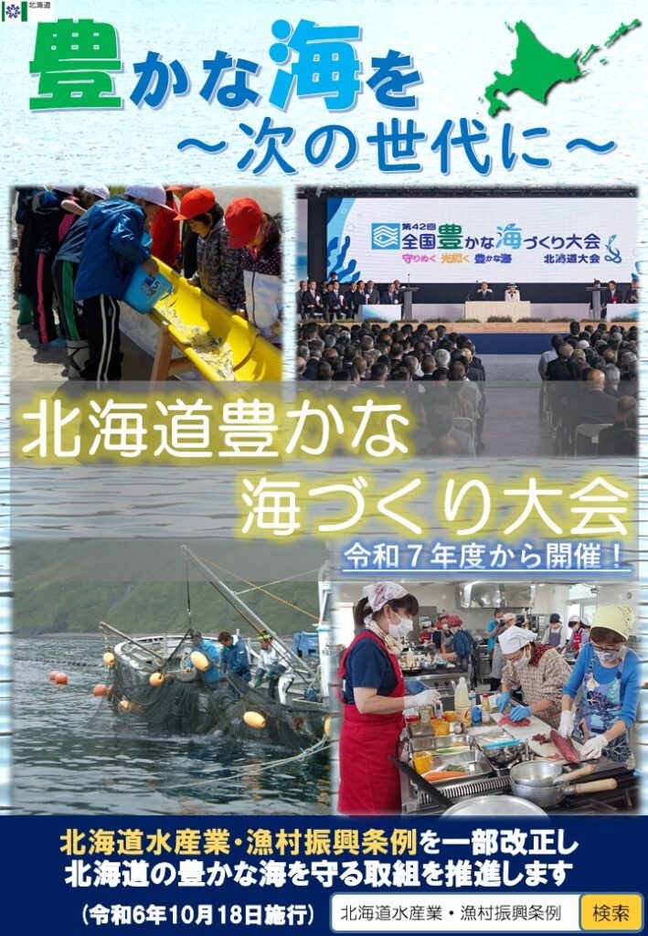 先人達の守り続けた海の恵みに感謝し、多面的な機能や価値を有する北海道の豊かな海を守り育て、次世代につなげるとともに、水産業の持続的な発展と地域の活性化を図るため、豊かな海づくりの中心的な行事として「北海道豊かな海づくり大会」を開催します。