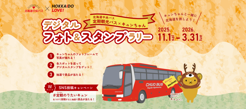 キュンちゃんと一緒に北海道を旅しよう! 定期観光バス×キュンちゃん≪デジタルフォト&スタンプラリー≫ 期間:2025年11月1日~2026年3月31日 ①キュンちゃんのフォトフレームで写真が撮れる! ②各スポットを巡ってデジタルスタンプをゲット! ③抽選で景品が当たる! ●Wチャンス・SNS投稿キャンペーン #定観のりたいキュン をつけて投稿すると抽選で景品が当たる!