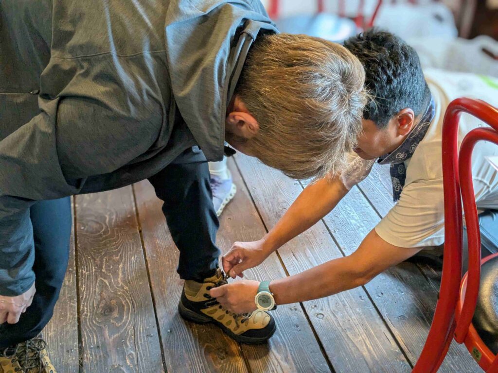 さあ、山登り!うっかり初心者の私は、スニーカーで来てしまった。もちろん、山登り用のレンタルシューズありますよ!準備不足にも、心強いのがアサリラウンジです。