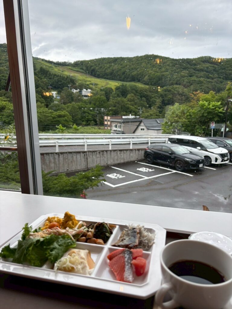 ホテル館内のレストランで、朝食はバイキング!いつもの事ですが、メニューも豊富で食べすぎちゃいます。またまた朝里川温泉スキー場を見ながら優雅な時間は最高です。