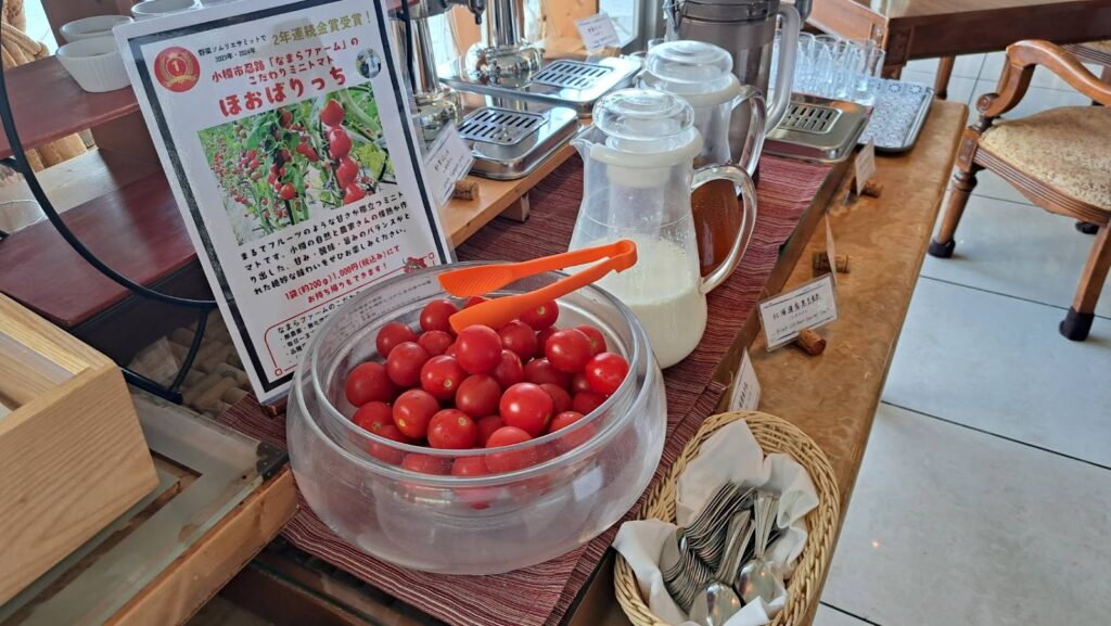 一般的なホテルの朝食では価格の安いトマトが使われることが多い中で、ホテルノイシュロス小樽は地元農家が育てた「ほおばりっち」をあえて選び、朝食バイキングで提供しています。