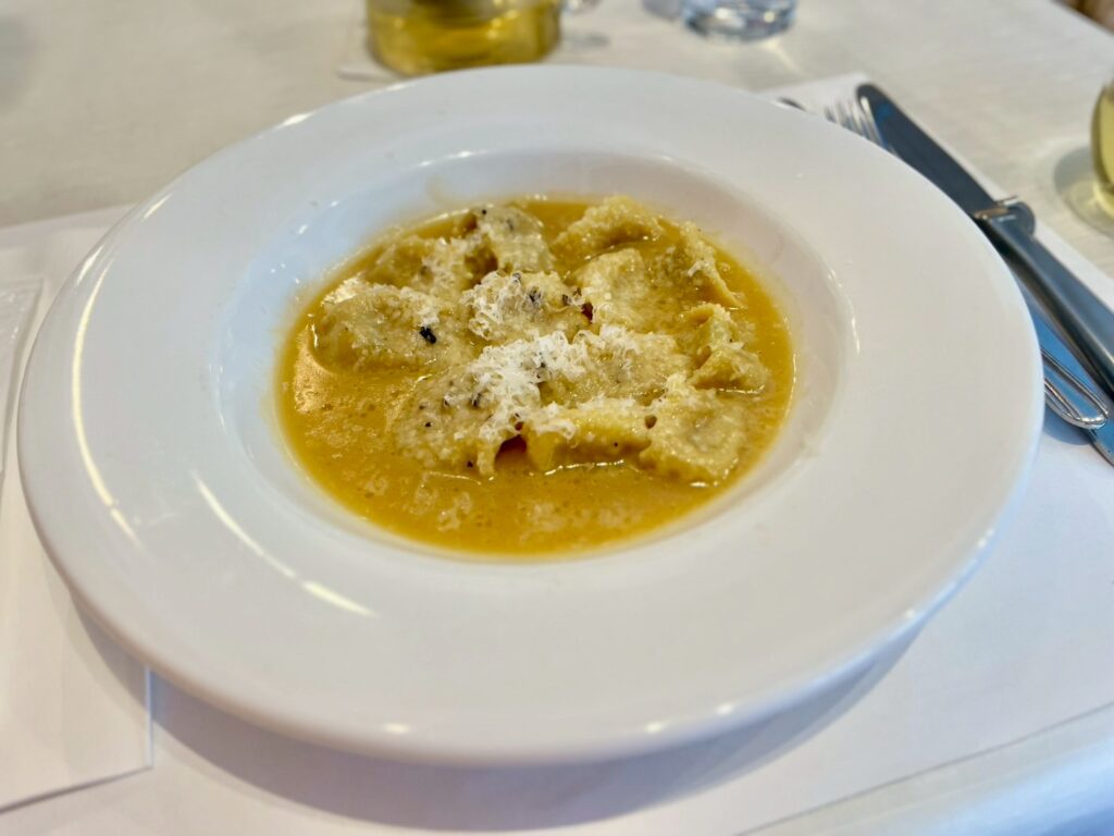 中身の仔牛はホロホロ、じゅわっと広がって口の中が一気に幸せモードだ。上にふりかけられたチーズの香りもかなり強いが全然くどくない。パスタ生地も滑らかで歯切れよくて、食べていてとても心地良い。