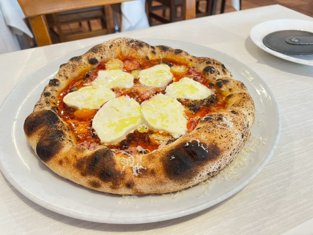 1口目、軽さのあるモッツァレラチーズとガツンとしたサラミの旨味。