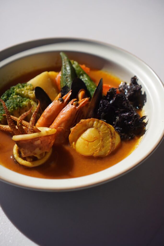 ホタテやエビなどの魚介の旨みを生かした一品。スパイスで冷えた体も温まり寒い冬にもピッタリの食事です。生の海鮮が苦手な方の選択肢としてもご利用いただいています。