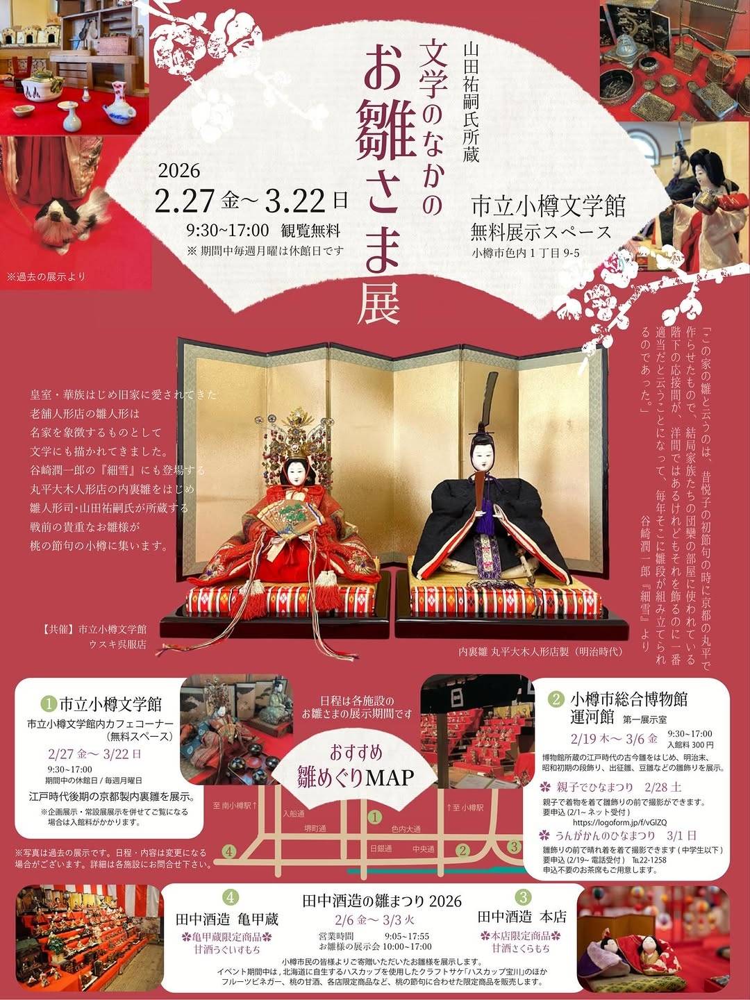 開催時期2026年 2月27日(金)終了時期2026年 3月22日(日)場所市立小樽文学館 無料展示スペース(小樽市色内1丁目 9-5)お問い合わせ山田祐嗣氏所蔵【文学のなかのお雛さま展 】イベントページはこちら