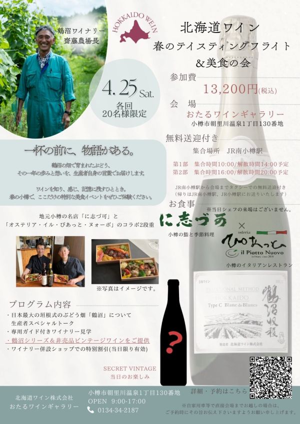 一杯の前に、物語がある。をテーマに、北海道ワイン(株)直轄農場「鶴沼ワイナリー」齋藤農場長によるスペシャルトークとともに、農場の四季を描く4K映像をお楽しみいただきます。そして小樽を代表する和食と洋食の名店がこの日のためにコラボレーションした【特製二段重美食BOX】とともに、鶴沼のテロワールが育んだワインとのマリアージュを、心ゆくまでご堪能ください。1日2回、各20名様限定の特別なプログラム。静かな感動と贅沢な味わいに包まれる、特別なひとときをお届けします。