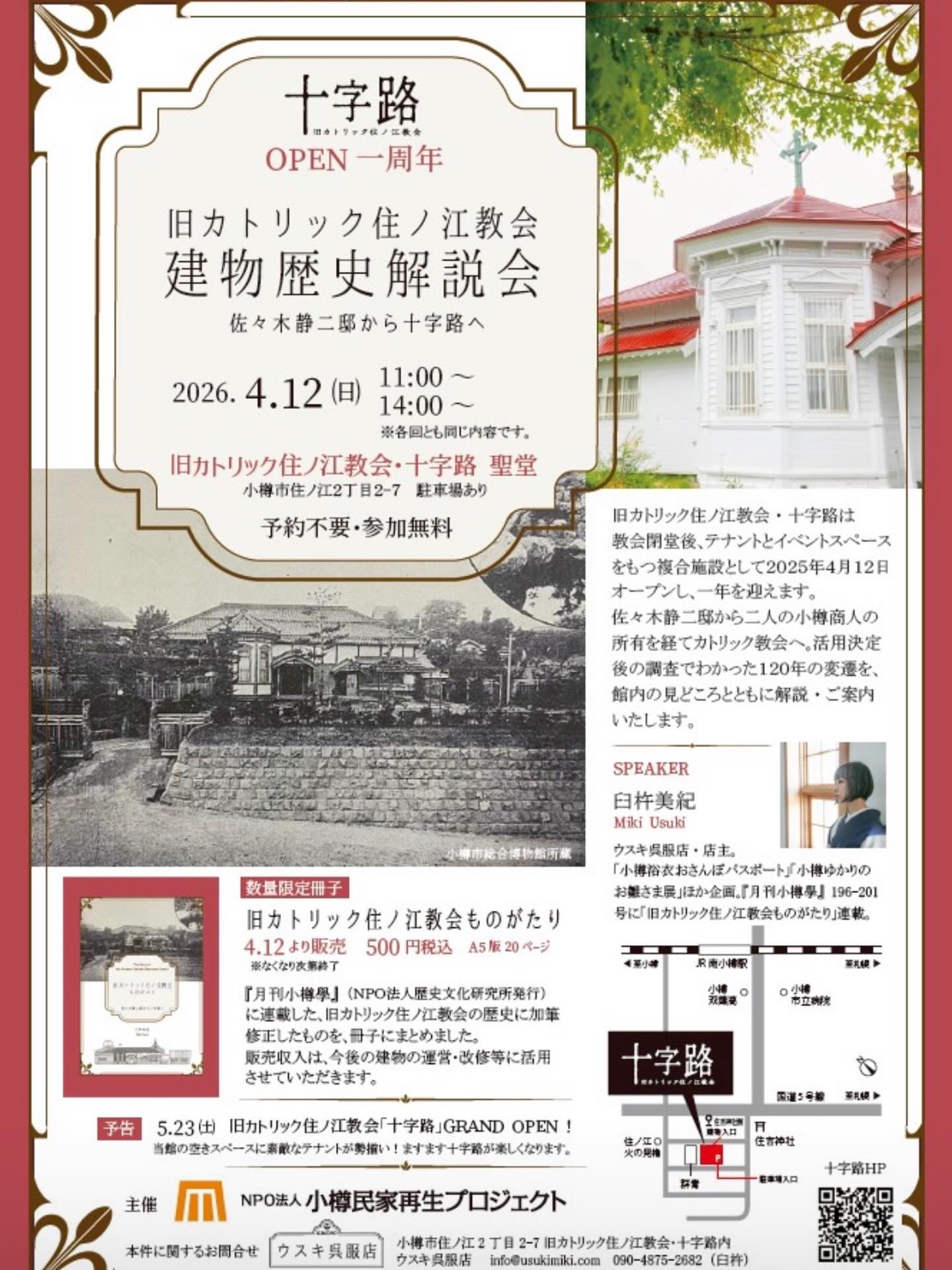 開催時期2026年 4月12日(日)終了時期2026年 4月12日(日)場所旧カトリック住ノ江教会・十字路 聖堂(小樽市住ノ江2丁目2-7)お問い合わせ旧カトリック住ノ江教会十字路は教会閉堂後、テナントとイベントスペースをもつ複合施設として2025年4月12日オープンし、一年を迎えます。イベントページはこちら