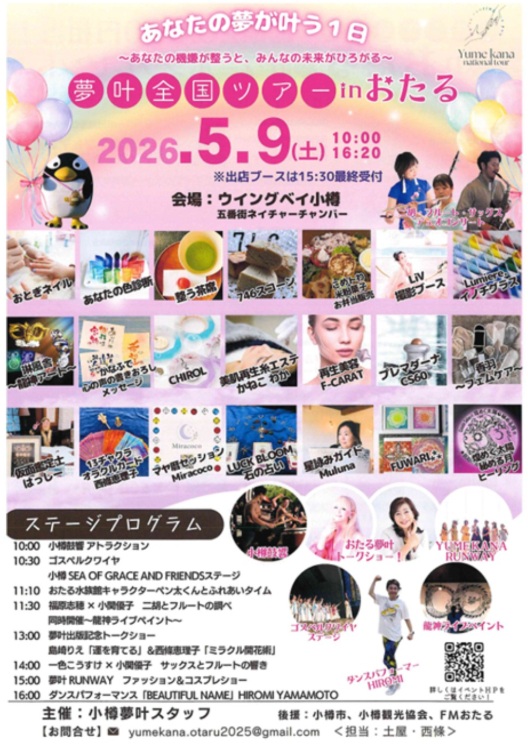 開催時期2026年 5月9日(土)終了時期2026年 5月9日(土)場所ウイングベイ小樽お問い合わせyumekana.otaru2025@gmail.com全国から「夢をかなえる」をテーマとした20ブースが出店するほか「小樽鼓響のアトラクション」「二胡とフルートのコンサート」「夢叶トークショー」「ダンスパフォーマンス」などのステージイベントも開催