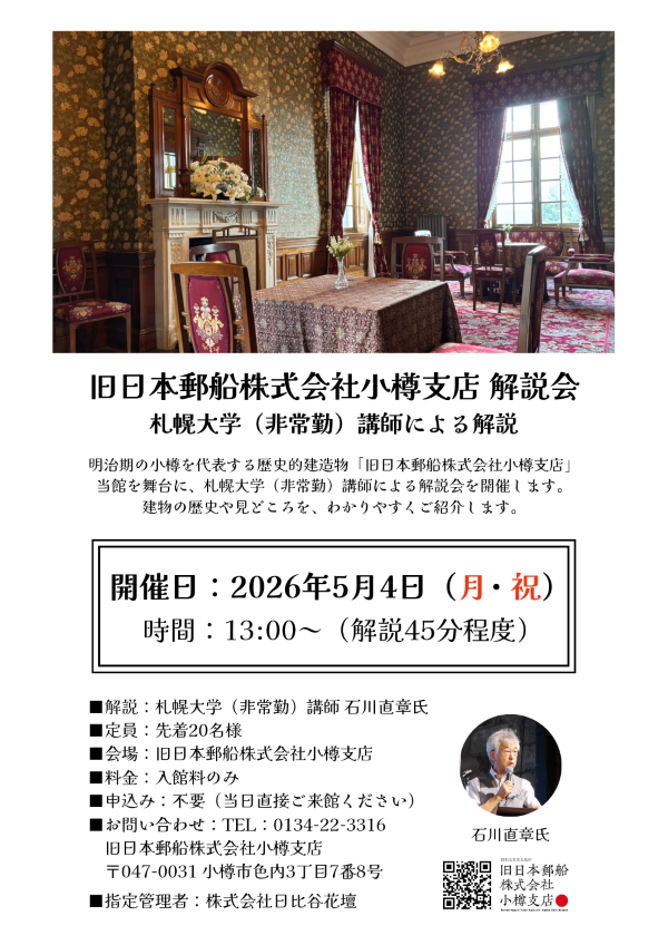 開催時期2026年 5月5日(火)終了時期2026年 5月5日(火)場所旧日本郵船株式会社小樽支店お問い合わせお問い合わせ先