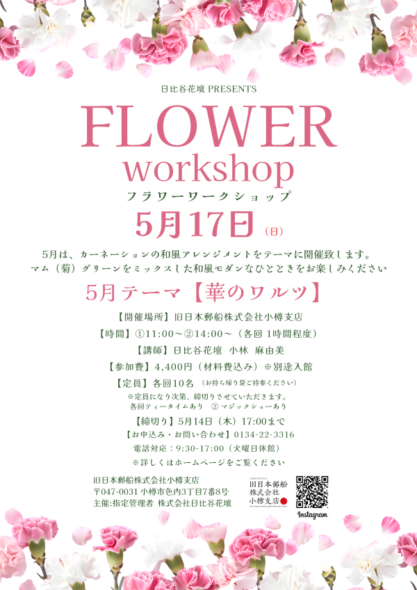 - 内容:5月は、カーネーションの和風アレンジメントをテーマに開催致します。マム(菊)グリーンをミックスした和風モダンなひとときをお楽しみください。
