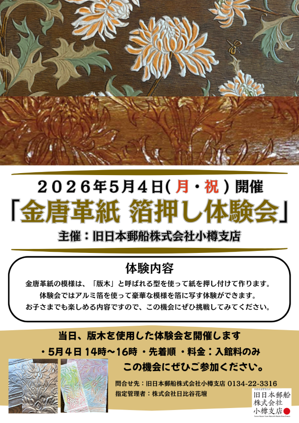 開催時期2026年 5月4日(月)終了時期2026年 5月4日(月)場所旧日本郵船株式会社小樽支店お問い合わせ旧日本郵船株式会社小樽支店 0134-22-3316イベントページはこちら- 毎月ご好評いただいております金唐革紙の版木を使用した箔押しワークショップを5月も開催いたします!