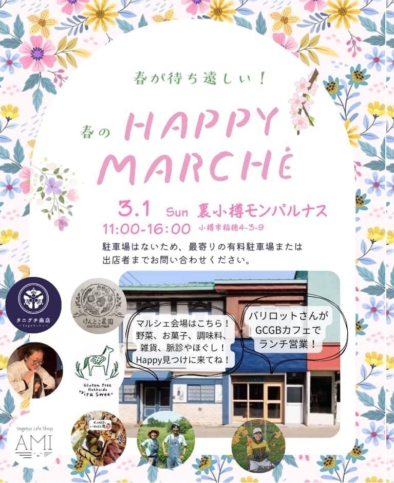 開催時期2026年 3月1日(日)終了時期2026年 3月1日(日)場所裏小樽モンパルナス(小樽市稲穂4-3-9)お問い合わせ久しぶりのHAPPY MARCHE開催です。野菜、お菓子、調味料、雑貨にマッサージ。レンタルカフェGCGBでは梁川通りのバリロットさんが出張ランチ営業。どうぞお楽しみに!イベントページはこちら