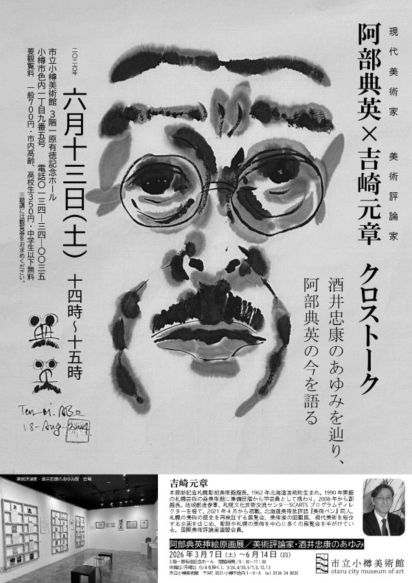 開催時期2026年 3月7日(土)終了時期2026年 6月14日(日)場所市立小樽美術館お問い合わせ北海道を代表する現代美術家・阿部典英(あべてんえい)は、彫刻・立体・インスタレーションなど多岐にわたる活動で知られ、長年にわたり、北海道の美術表現の発展に寄与してきました。その一方で、新聞連載小説の挿画や定期刊行物の表紙原画にも取り組み、詩情とユーモアをたたえた独自の世界を築いています。イベントページはこちら
